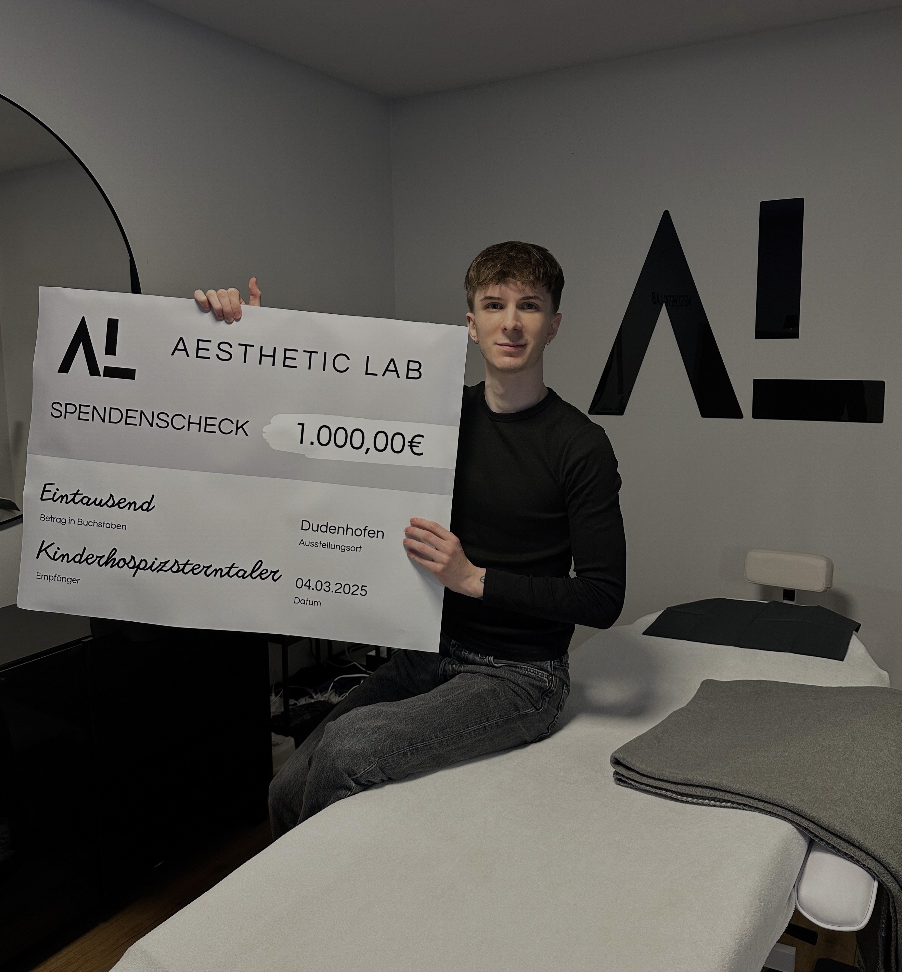 Am 22. Februar 2025 fand im Aesthetic Lab Schifferstadt eine besondere Spendenaktion unter dem Motto "Gutes für dich – Gutes für andere" statt. An diesem Tag gab es ausschließlich die Aqua-Facial-Behandlung, und die gesamten Einnahmen wurden vollständig gespendet. Dank eurer Unterstützung konnten wir 1.000,00 € für das Kinderhospiz Sterntaler in Dudenhofen sammeln!